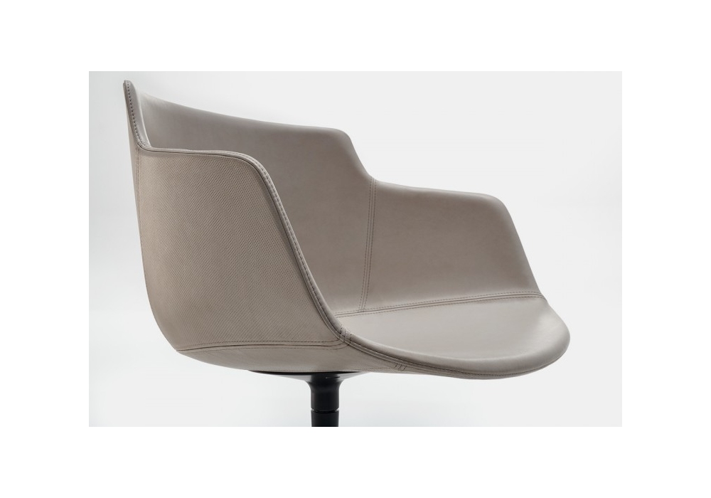 Flow Leather conçue par Jean Marie Massaud pour MDF Italia est une chaise avec piètement en aluminium peint avec des poudres époxy de différentes couleurs mates. Le revêtement est en cuir aniline (coque externe perforée, interne lisse) ou Nuvola (coque externe lisse, interne perforé) dans différentes finitions. Rotatif à 360°.