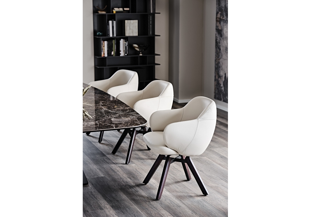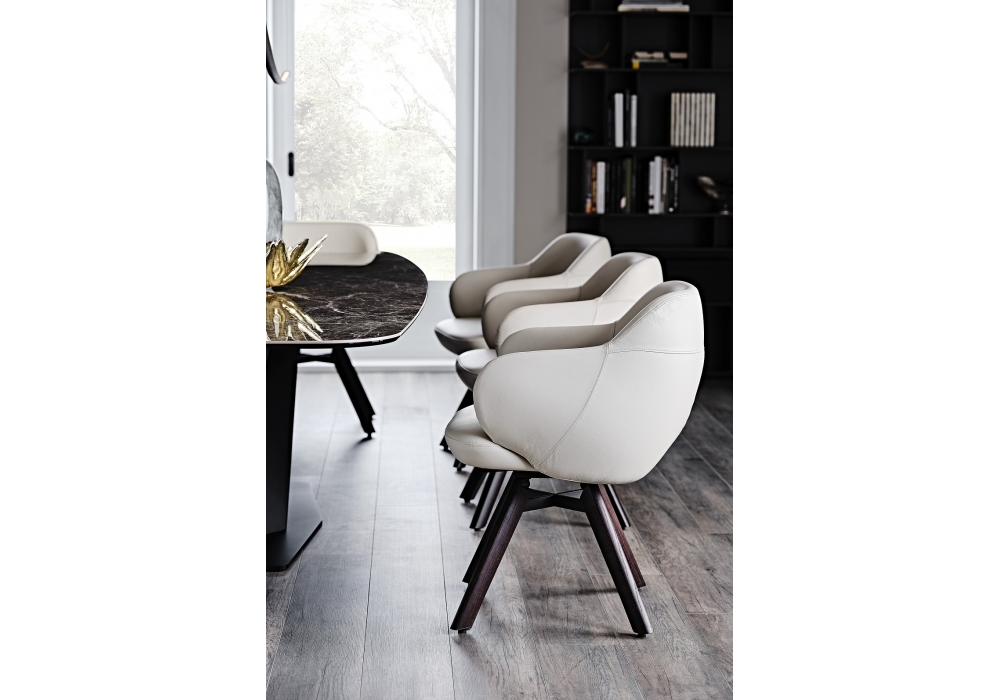 Bombè conçue par Paolo cattelan pour Cattelan Italia est une chaise pivotante avec structure en acier gaufré, pieds en frêne et revêtement en tissu, synthetic nubuck, simili cuir ou cuir.
