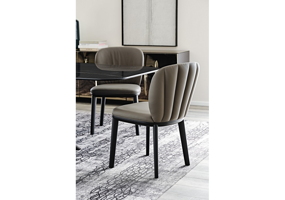 Chrishell conçue par Paolo cattelan pour Cattelan Italia est une chaise avec coque matelassée et base en bois massif de frêne laqué. Revêtement disponible en tissu, synthetic nubuck, micro nubuck, simili cuir ou cuir.