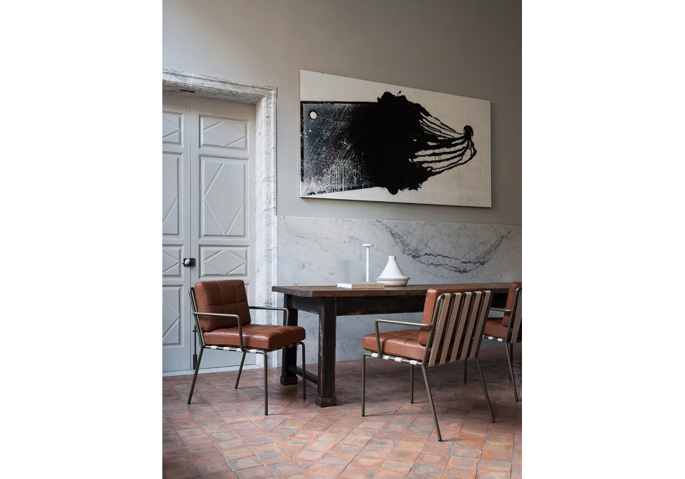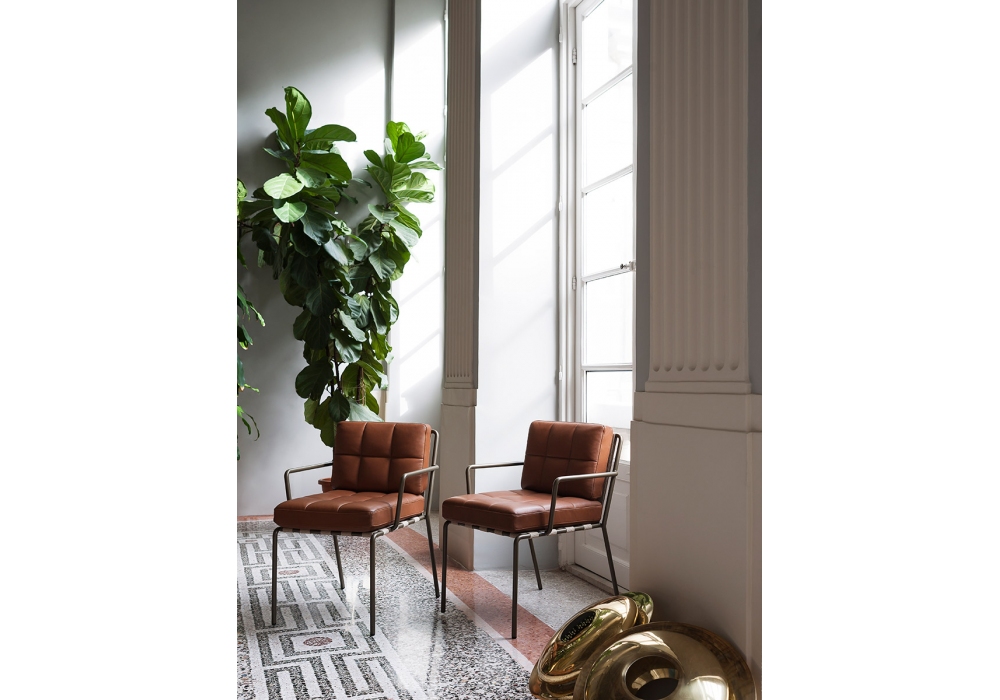 Memory Lane conçue par Christophe Pillet pour Tacchini est une chaise avec rembourrage en mousse de polyuréthane multi-densité. Base avec structure tubulaire en métal thermolaqué de différentes couleurs, avec sangles élastiques beiges qui soutiennent l'assise et le dossier. La housse est amovible et disponible en différents tissus et finitions.