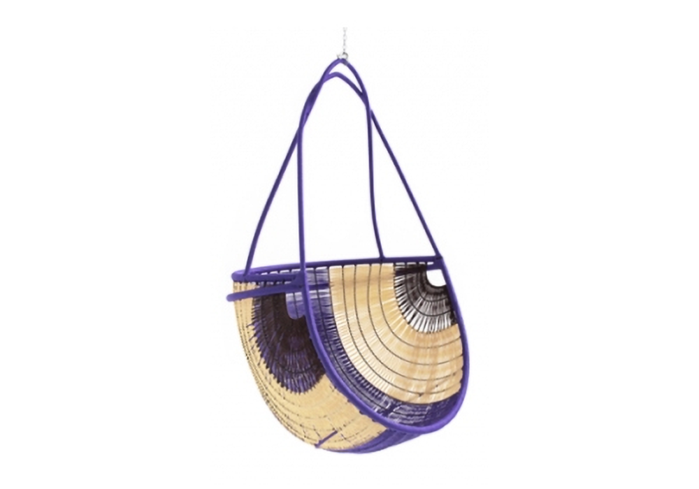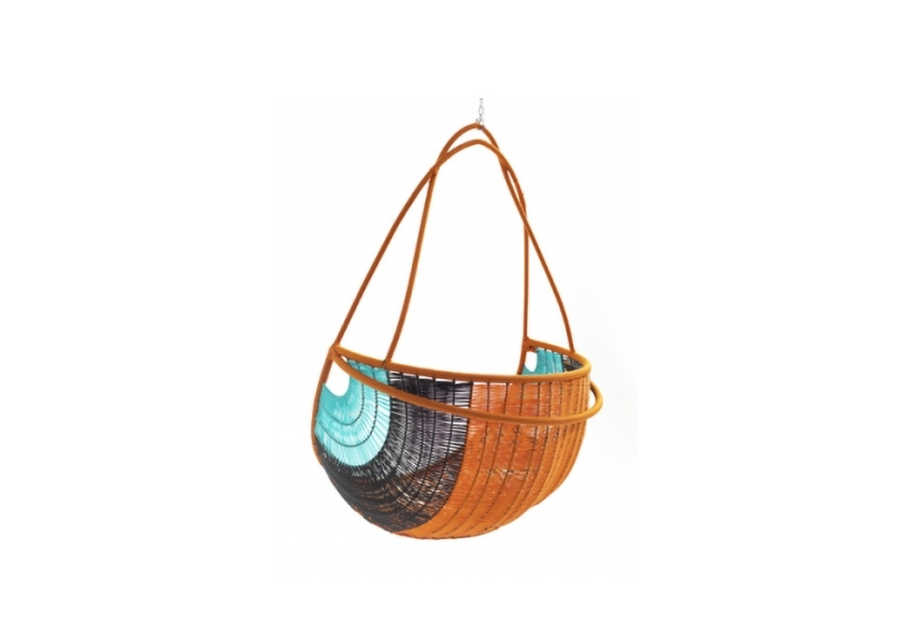 Arco conçue par Martino Gamper pour Moroso est une chaise suspendue réalisée avec une base en acier peint et des fils de polyéthylène colorés tissés à la main.