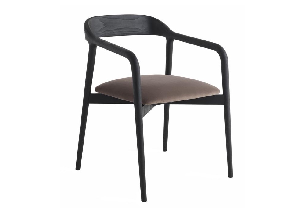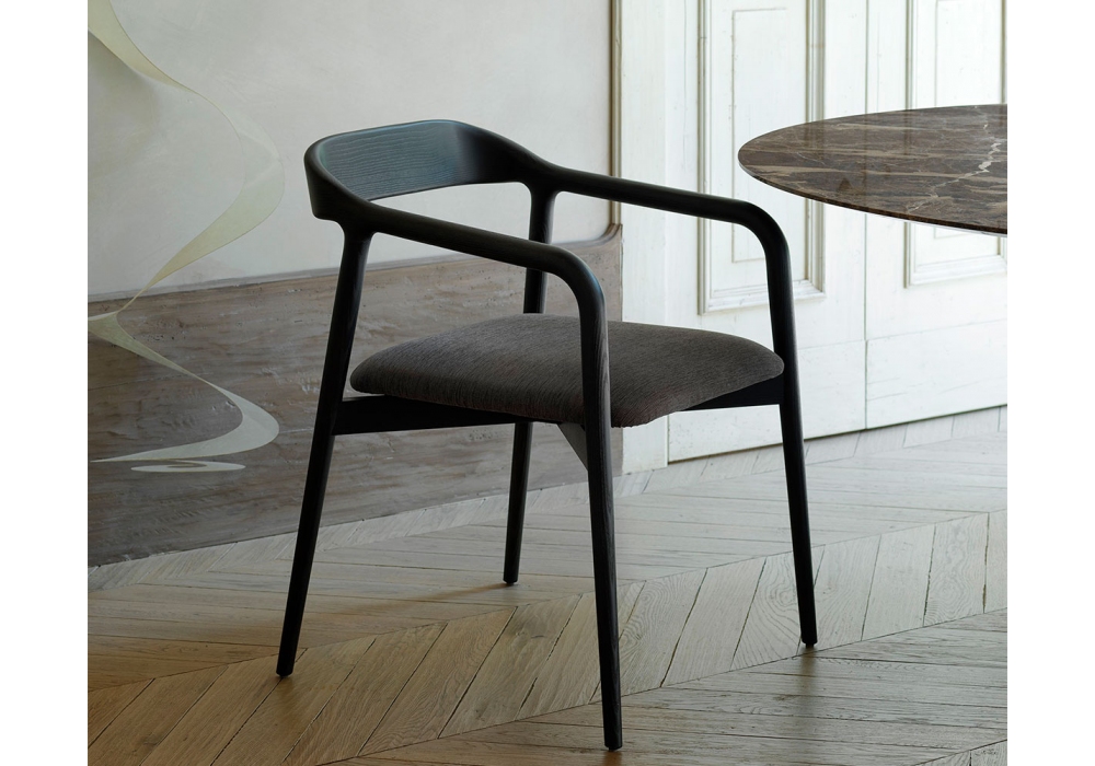 Velasca conçue par Studio Balutto pour Casamania & Horm est une chaise réalisée avec une structure en frêne massif et assise en contreplaqué rembourré et revêtement en tissu, simili cuir ou cuir.