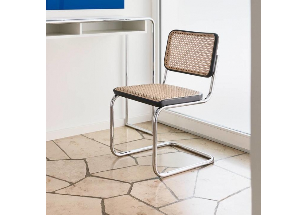 S 32 V conçue par Marcel Breuer, Copyright artistique Mart Stam pour Thonet est une chaise luge avec structure en tube d'acier chromé. Assise et dossier en rotin tressé. Bordure du dossier et de l'assise disponible en différentes finitions.