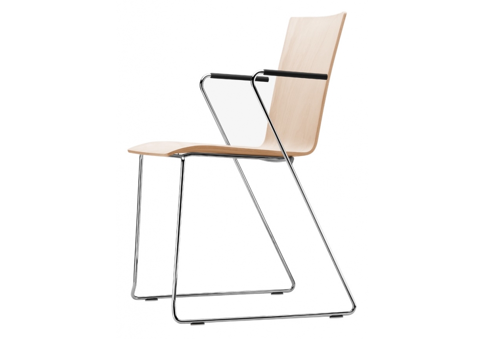 S 182 / 184 conçue par Delphin Design pour Thonet est une chaise empilable en fil d'acier chromé et pieds en plastique. Coque en contreplaqué de hêtre façonné disponible en différentes finitions et en deux tailles. La chaise est également disponible avec ou sans accoudoirs.