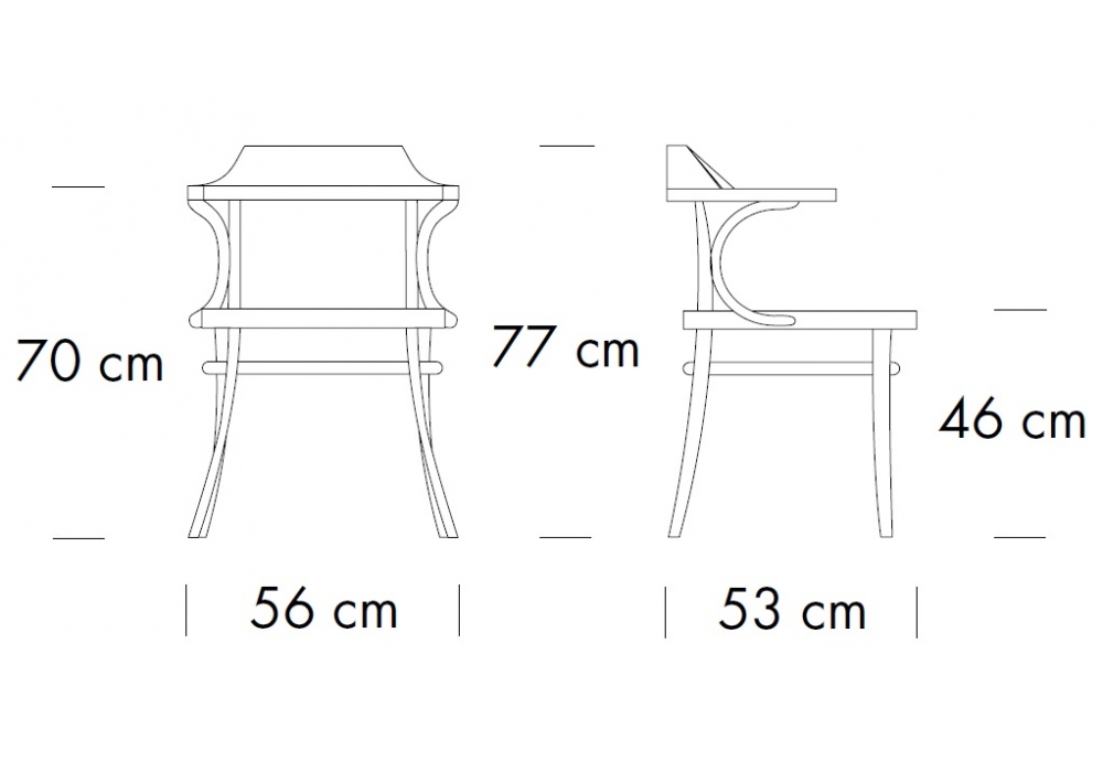 233 M conçue par Gebrüder Thonet pour Thonet est une chaise avec accoudoirs en bois courbé et pieds en plastique. Assise en contreplaqué façonné. Structure en hêtre, disponible en différentes finitions ou dans la variante en frêne traité à l'huile.