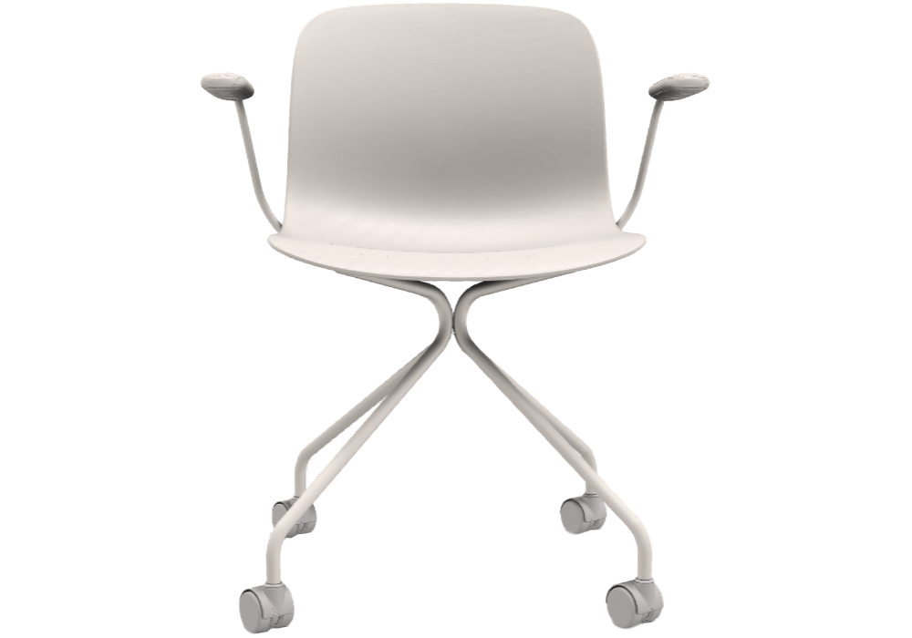 Troy 4 Star Wheels Polypropylene conçue par Marcel Wanders pour Magis est une chaise à 4 branches, sur roues avec assise et accoudoirs en polypropylène, structure en tube d'acier chromé ou peint.