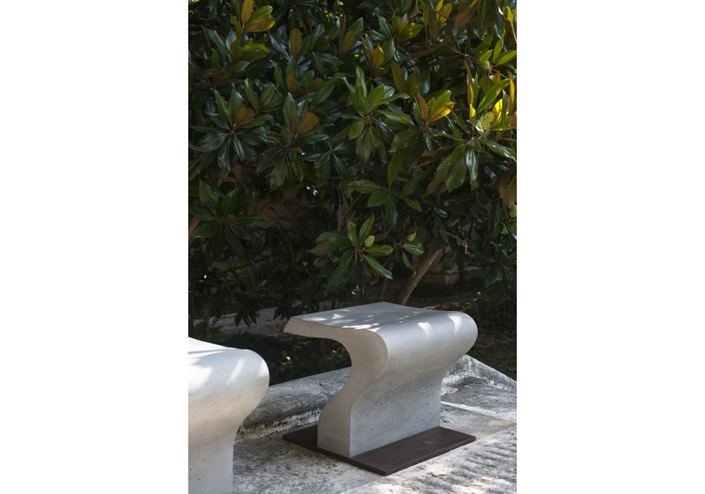 Clizia conçue par Mangiarotti pour AgapeCasa est une chaise d'intérieur ou d'extérieur en marbre blanc de Carrare, marbre noir Marquina, Travertin ou béton fibré avec base en fer oxydé.