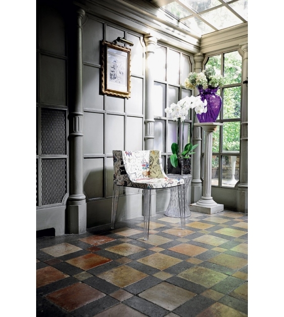 Mademoiselle "à la mode" Moschino conçue par Philippe Starck pour Kartell est une chaise réalisée avec structure en polycarbonate transparent ou noir teinté dans la masse et assise en polyuréthane recouvert de tissu Moschino.