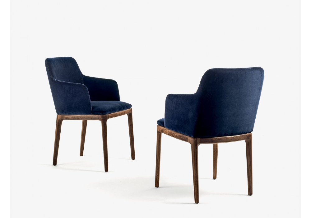 Cloe Arm conçue par C.R. & S. Riva 1920 est une chaise avec pieds en bois massif et coque en mousse de polyuréthane en continuité avec l'assise et le dossier. Revêtement en cuir ou en tissu, dossier avec coutures en losange ou lisse.