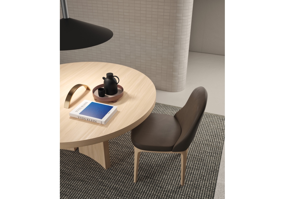 Greta conçue et produite par Marac est une chaise avec structure en bois de sapin (Picea Abies) et contreplaqué, avec sangles élastiques. Pieds en bois de frêne massif, couleur naturelle, couleur moka, noyer et couleur fumée. Couverture fixe en tissu et cuir dans différentes finitions.