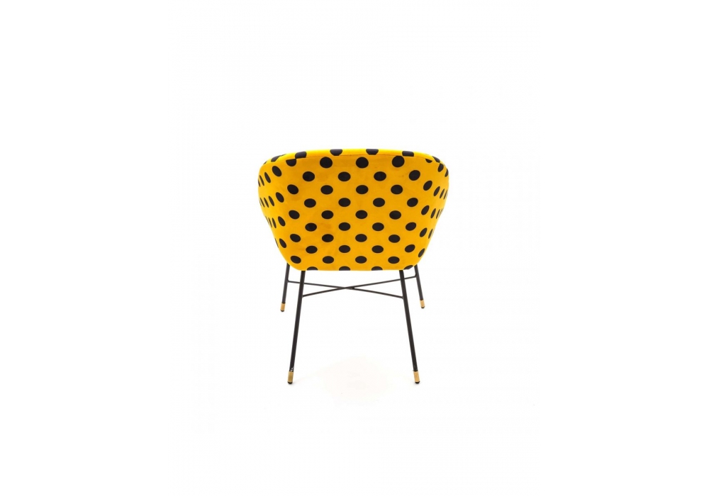 Shit conçue par Toiletpaper pour Seletti est une chaise avec base à quatre pieds en métal tubulaire peint en noir et détails en laiton. Le corps est rembourré de polyuréthane avec revêtement en polyester.