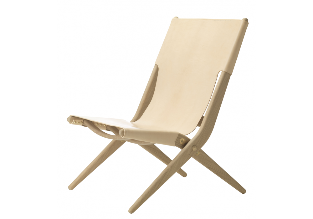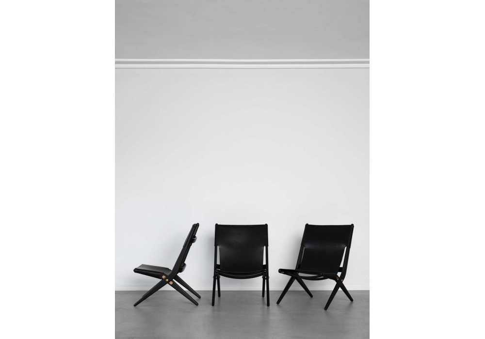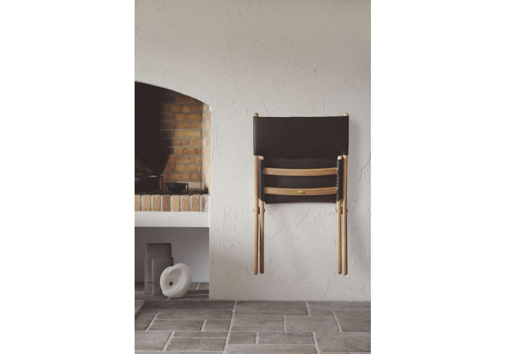 Saxe conçue par Mogen Lassen pour Audo Copenhagen est une chaise pliante en cuir, laiton et bois de chêne. Il est possible d'acheter le Saxe Hang Up pour accrocher la chaise au mur. Disponible en différentes finitions.