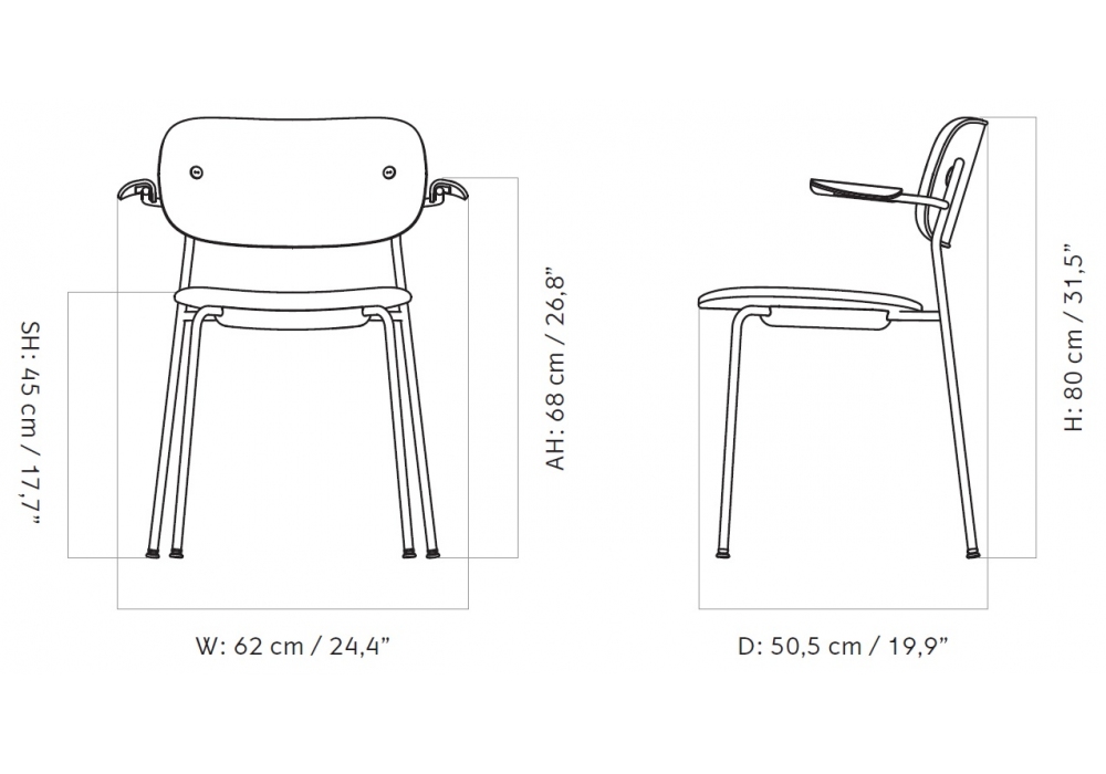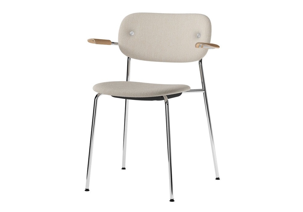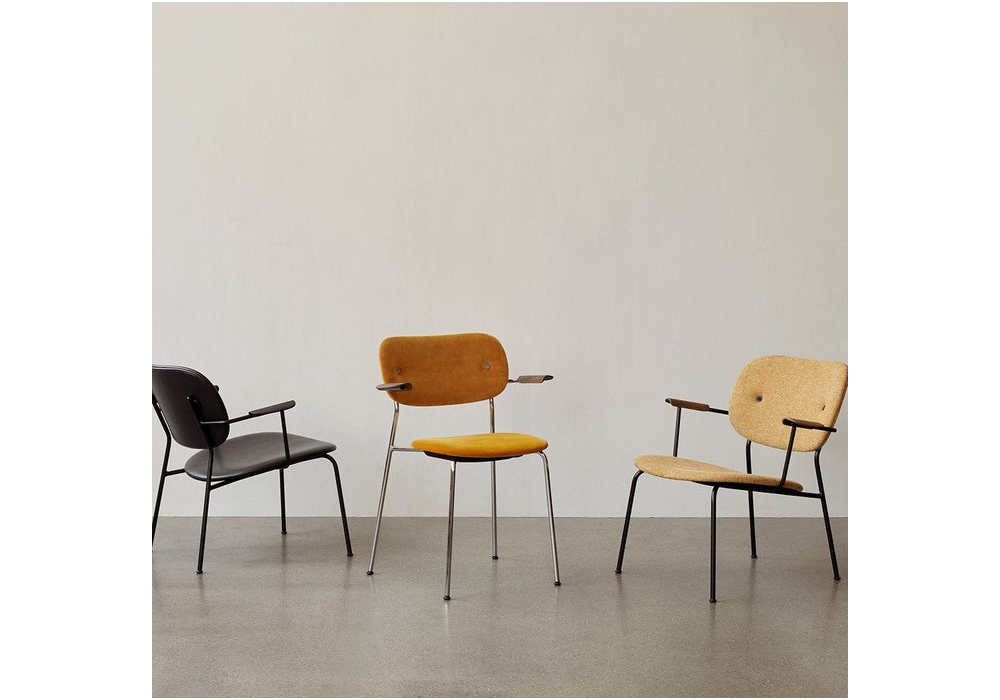 Co Fully conçue par Norm Architects & Els Van Hoorebeeck pour Audo Copenhagen est une chaise avec pieds en acier tubulaire enduit de poudre noire ou chromée, assise et dossier rembourrés, revêtement en tissu ou cuir. Accoudoirs en chêne teinté naturel, foncé ou noir.