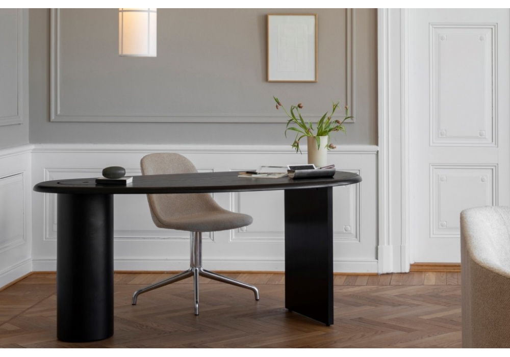 Harbour Side Swivel conçue par Norm Architects pour Audo Copenhagen est une chaise avec coque rembourrée revêtue en tissu ou cuir, base en aluminium. Disponible en différentes finitions.
