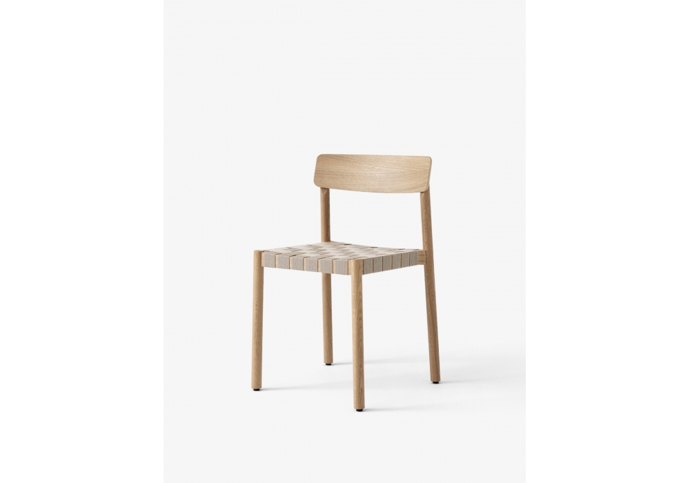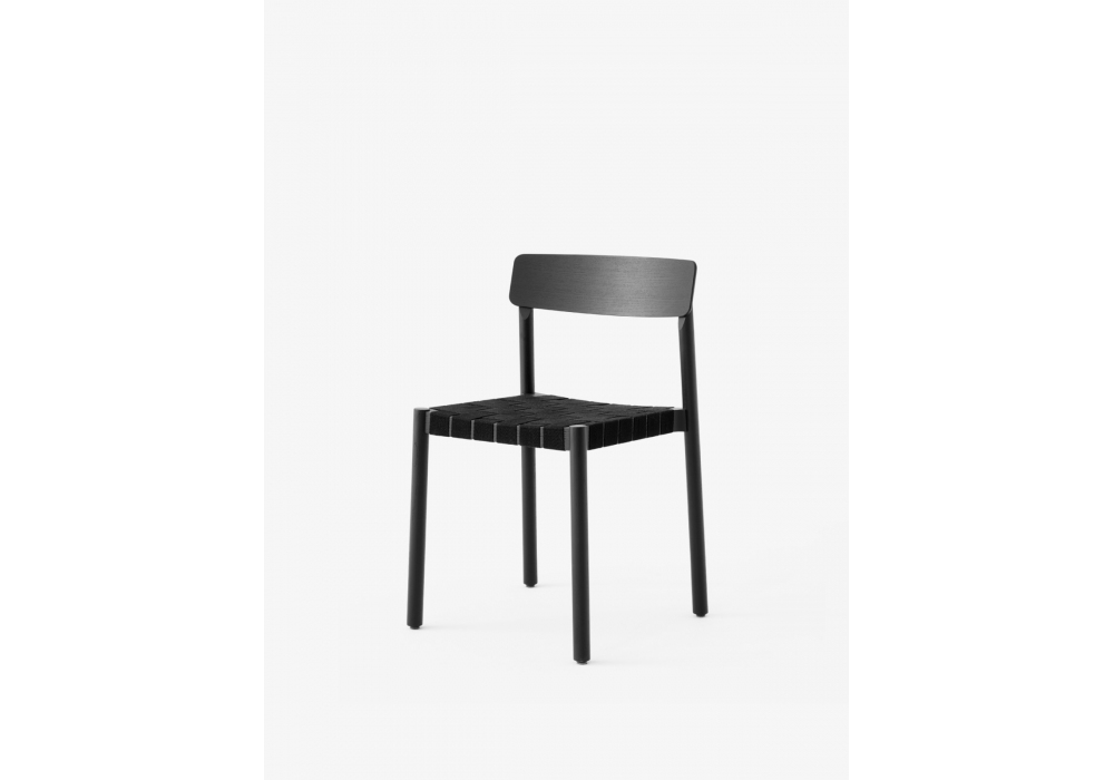 Betty conçue par Thau & Kallio pour &Tradition est une chaise empilable en bois massif et placage formpressed avec assise en toile de lin naturel ou noir.
