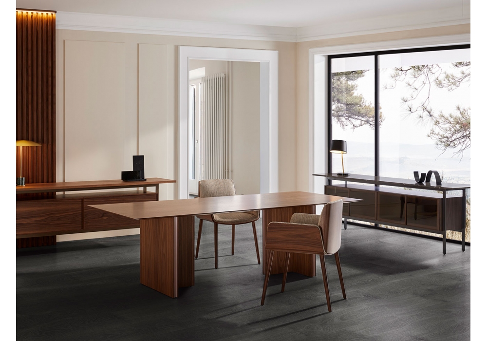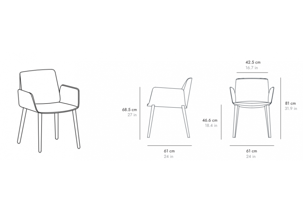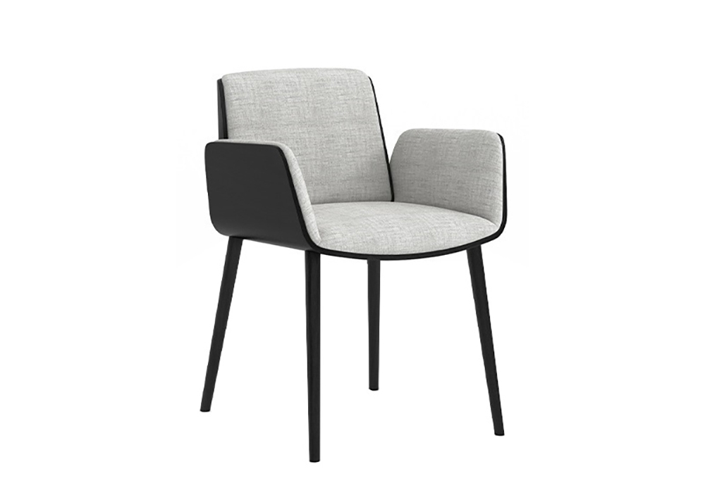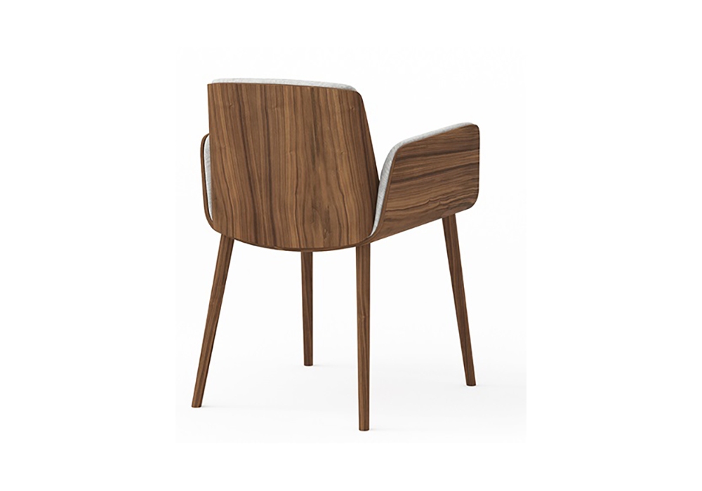 Hug conçue par Manel Molina pour Punt est une chaise avec structure et pieds en bois plaqué noyer ou chêne et revêtement en tissu ou cuir. Disponible en différentes finitions.