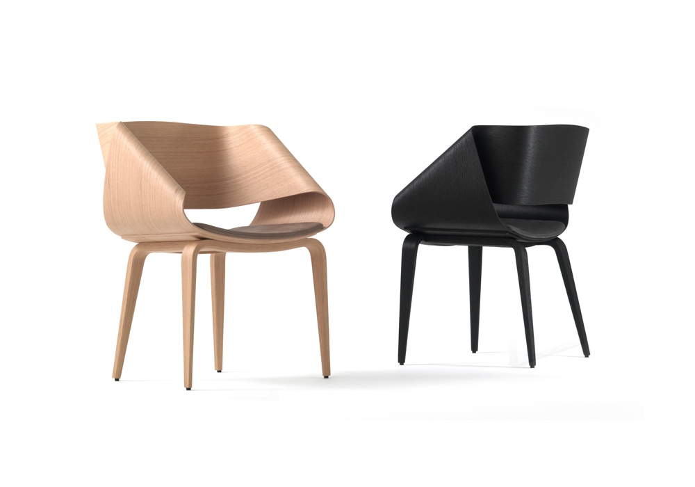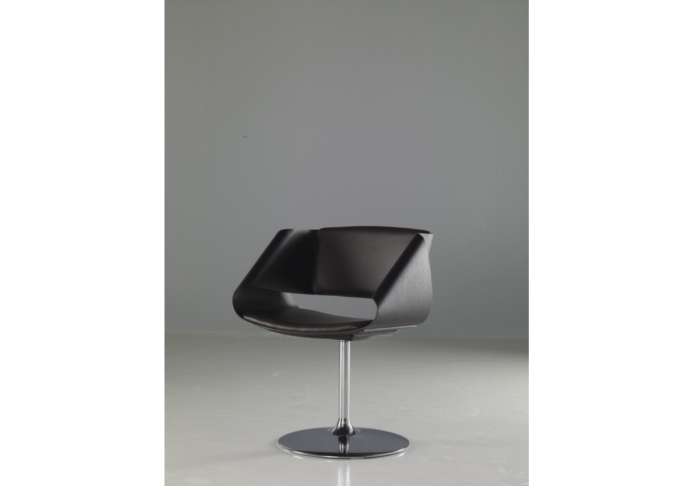 Nastro conçue par G. D. Harcourt pour Emmemobili est une chaise réalisée en une seule feuille de contreplaqué courbé plaqué. Proposition avec base pivotante ou fixe avec quatre pieds en métal. Coussin fixe avec support en bois rembourré de mousse recouvert de cuir.