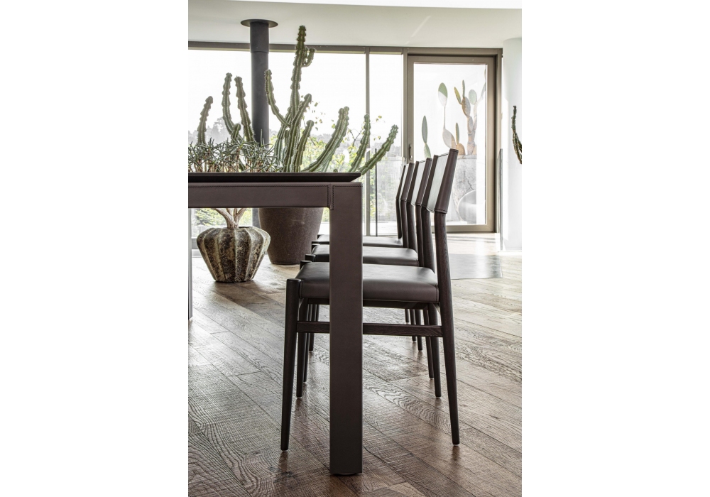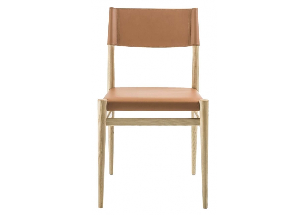 Ledermann Light conçue par Tom Kelley pour Enrico Pellizzoni est une chaise avec pieds en bois, assise et dossier rembourrés en cuir. Disponible en différentes finitions.
