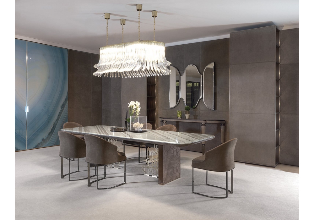 Daphne conçue par Giuseppe Iasparra pour Longhi est une chaise avec structure en métal brillant ou mat et revêtement inamovible en cuir ou velours. Disponible en différentes finitions.