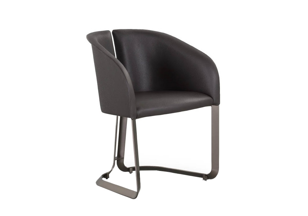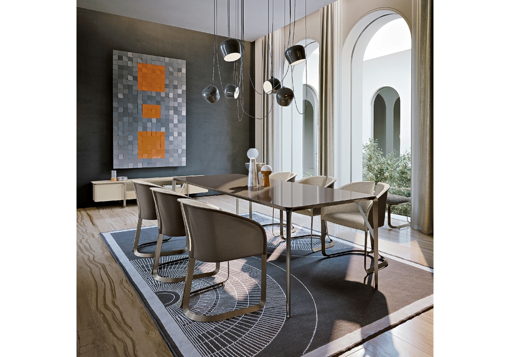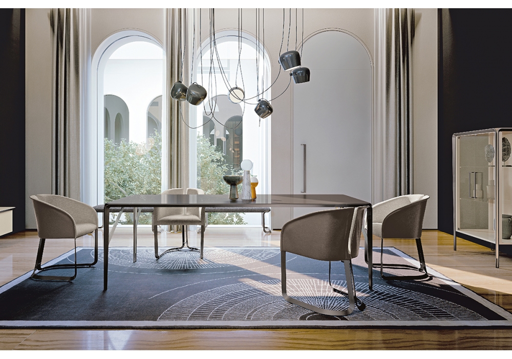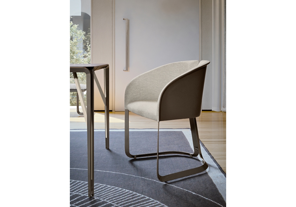 Milano conçue par Blengini Ghirardelli pour Turri est une chaise avec base en métal courbé en finition nickel brossé avec pieds en matière plastique. Structure en contreplaqué rembourrée de mousse de polyuréthane multi-densité avec revêtements inamovibles en différents tissus ou cuirs.