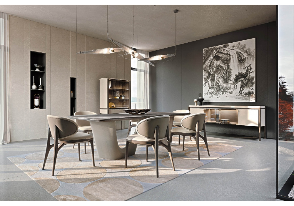 Pinnacle conçue par Huang Quan pour Turri est une chaise avec structure en contreplaqué et noyer massif et revêtement inamovible en tissu ou cuir. Pieds avec caoutchouc de protection. La coque peut être réalisée dans différents cuirs ou tissus.