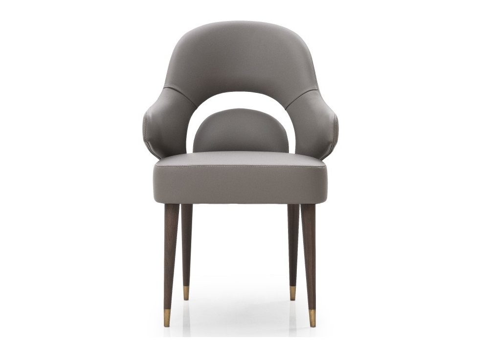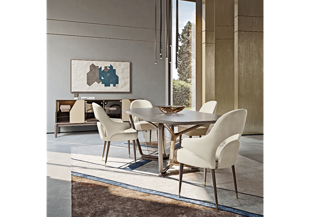 Vine conçue par Frank Jiang pour Turri est une chaise avec structure en contreplaqué et bois massif rembourrée de mousse de polyuréthane multi-densité. Revêtement inamovible en tissu ou cuir. Pieds en noyer massif en différentes finitions avec parties métalliques en finition or brossé ou bronze.