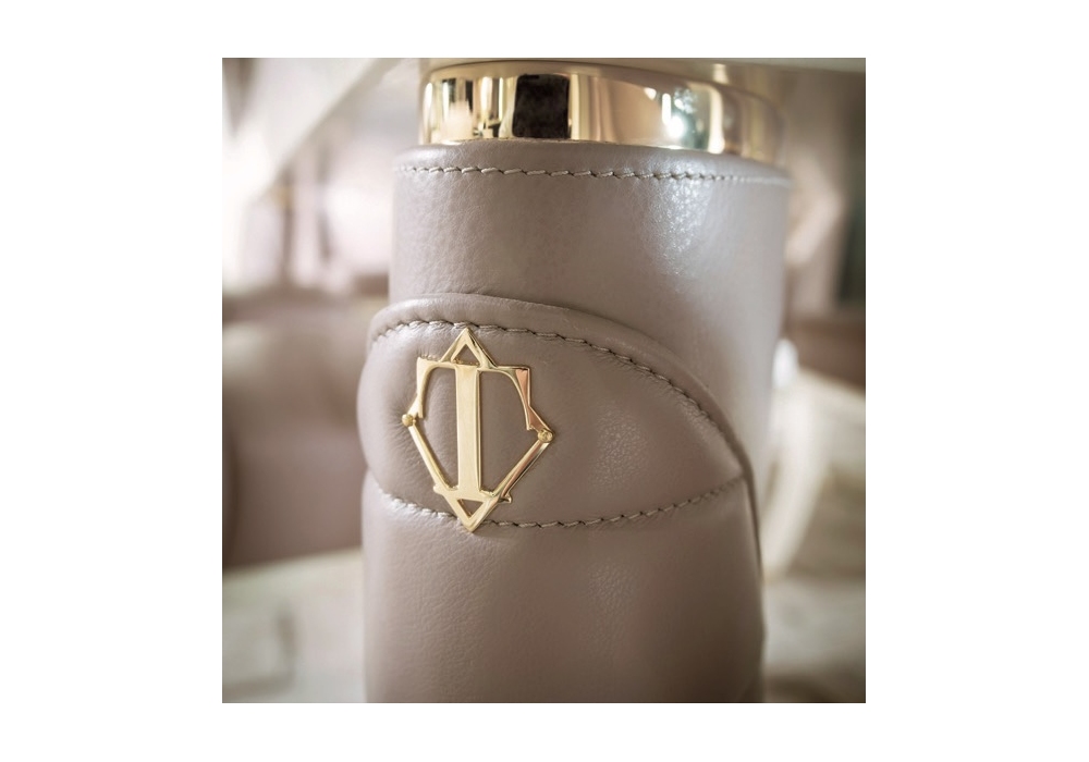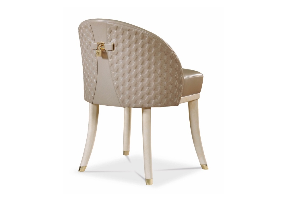 Vogue conçue par Andrea Bonini pour Turri est une chaise avec structure en bois massif avec finition polyester brillante décorée à la main. Revêtement en cuir ou tissu non amovible avec dossier avec broderie hexagonale. Pièces métalliques en finition dorée. Disponible dans la version avec dossier haut ou bas.