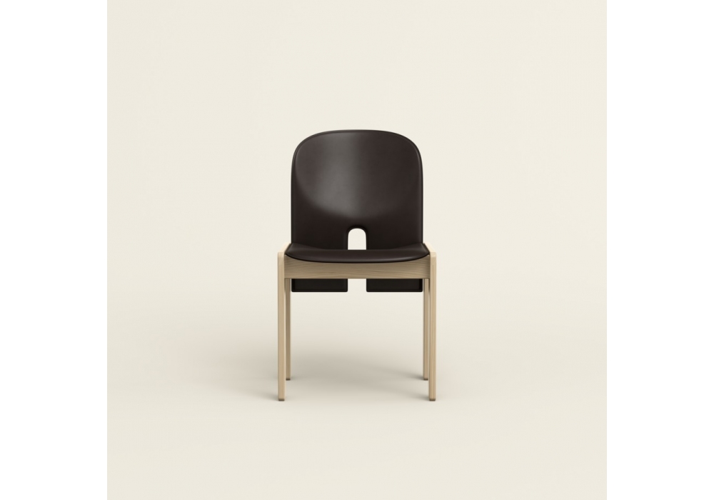 Scarpa 121 conçue par Afra & Tobia Scarpa pour Karakter est une chaise réalisée avec une structure en frêne massif, un revêtement en cuir sellier et des patins en plastique.