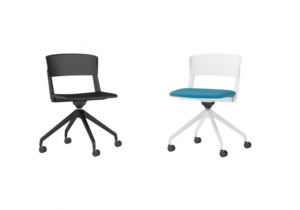 Yugen conçue par Paolo Scagnellato & Jeremiah Ferrarese pour Sitlosophy est une chaise pivotante rembourrée en polypropylène noir ou blanc. Le piètement pyramidal à 4 pieds est en nylon assorti à la structure. Rembourrage en mousse de polyuréthane souple recouverte de divers tissus ou éco-cuirs.