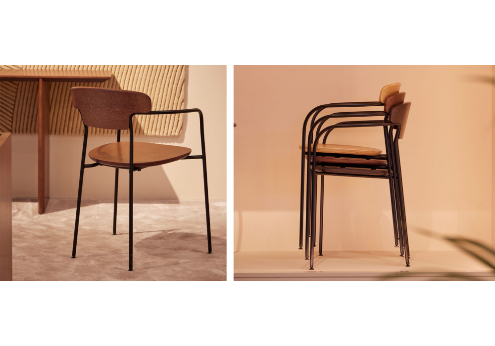 Pecan conçue par Sebastian Herkner pour Punt est une chaise avec structure en métal finition noire et assise et dossier en contreplaqué de chêne naturel. Empilable jusqu'à 4 chaises.