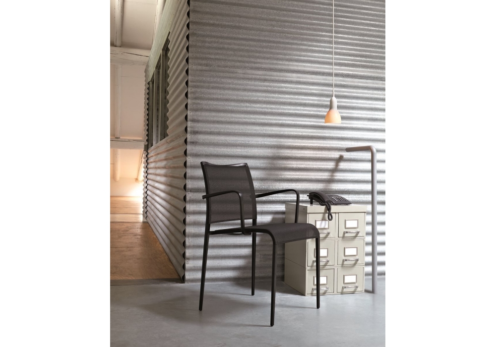 Sand Light conçue par Pocci e Dondoli pour Desalto est une chaise empilable avec structure en aluminium moulé sous pression. Assise et dossier en maille polyester recouverte de PVC (dans la version Canatex la maille est recouverte de PVC et de chanvre). Disponible en différentes finitions et dans la version avec ou sans accoudoirs.