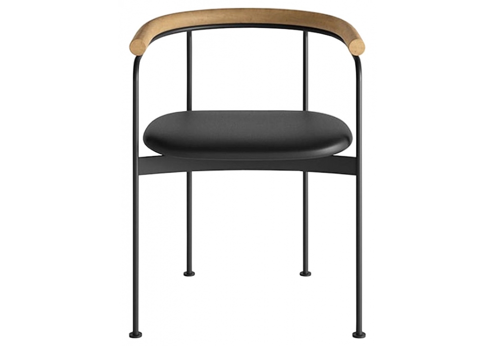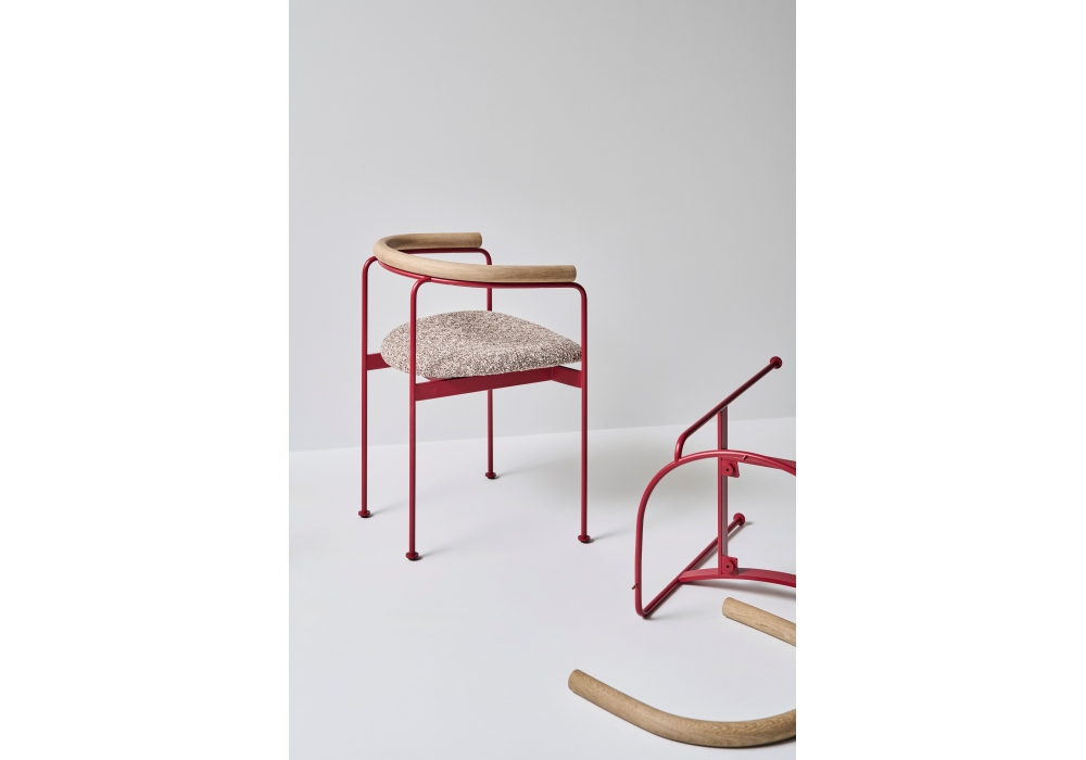 Baia conçue par Kensaku Oshiro pour Dk3 est une chaise avec structure en acier thermolaqué, plateau en bois et assise recouverte de tissu ou de cuir. Disponible en différentes finitions.