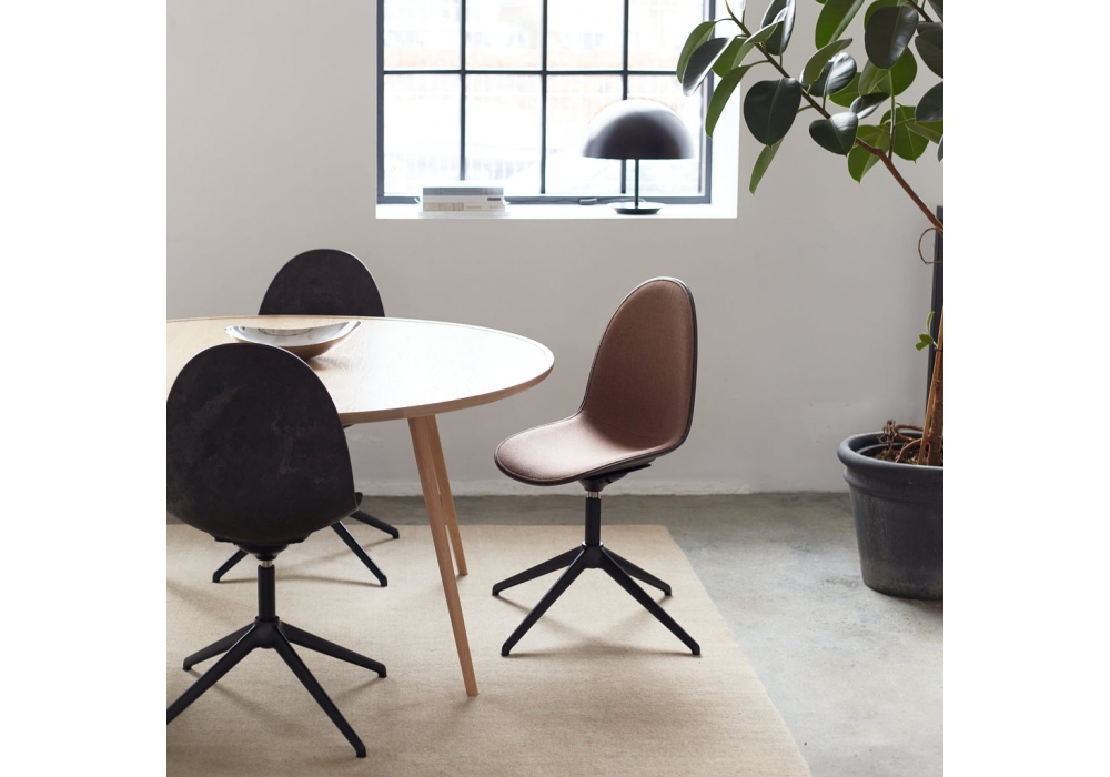 Eternity conçue par Space Copenhagen pour Mater est une chaise pivotante rembourrée avec base en aluminium peint noir ou brillant, assise en Matek® avec revêtement en tissu. Disponible dans la version avec revêtement complet ou couvrant uniquement l'assise.