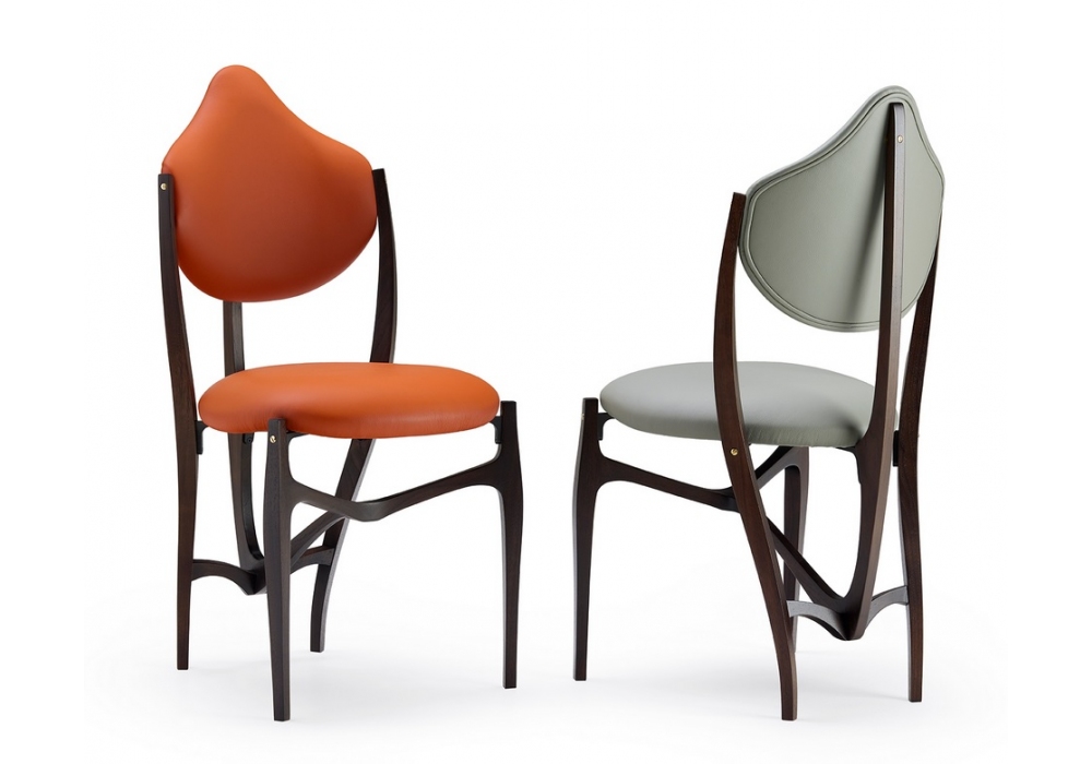 Stellage 52 conçue par Gabetti & Isola, Raineri pour Ceccotti Collezioni est une chaise avec structure en noyer américain massif. Assise et dossier en contreplaqué de peuplier, rembourrés, recouverts de tissu ou de cuir. Pièces en fer finition nickel noir et vis en laiton poli. Disponible en différentes finitions.