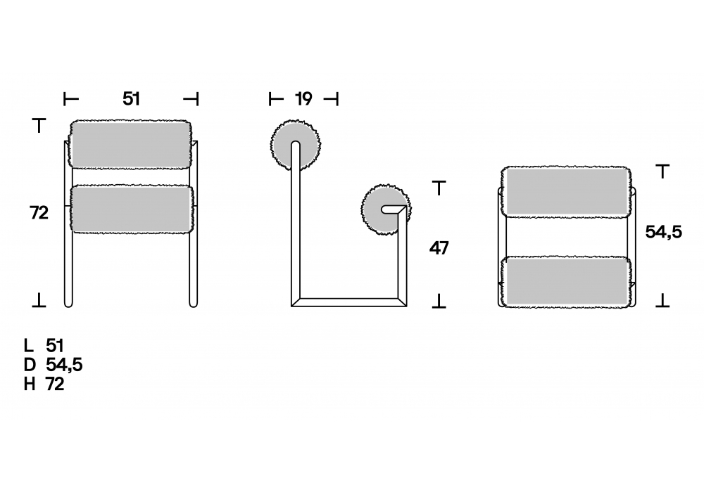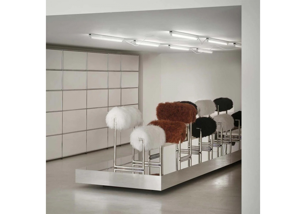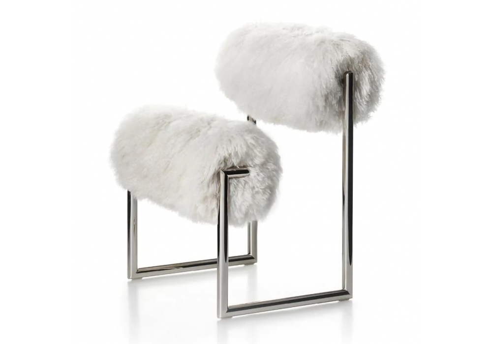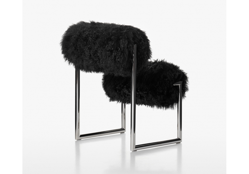Due Più conçue par Nanda Vigo pour Acerbis est une chaise avec structure en tube d'acier et revêtement d'assise et de dossier en fourrure de Mongolie. Due Più est disponible en différentes finitions.