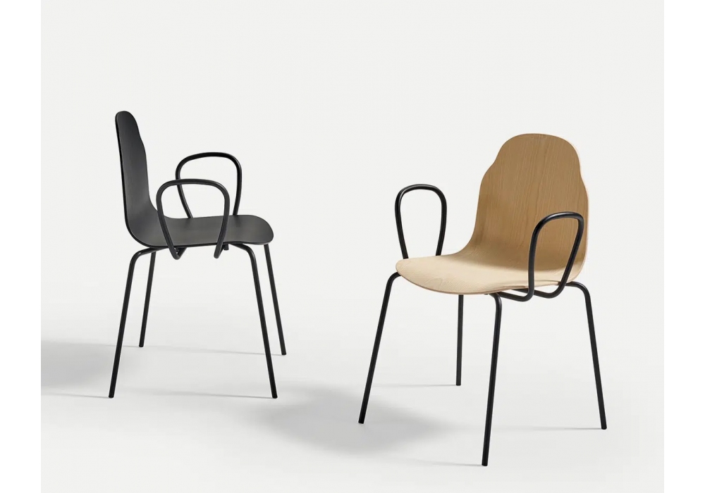Body Metal conçue par Sylvain Willenz pour Sancal est une chaise avec pieds en métal et coque en bois. Disponible en différentes finitions et dans la version avec ou sans accoudoirs.
