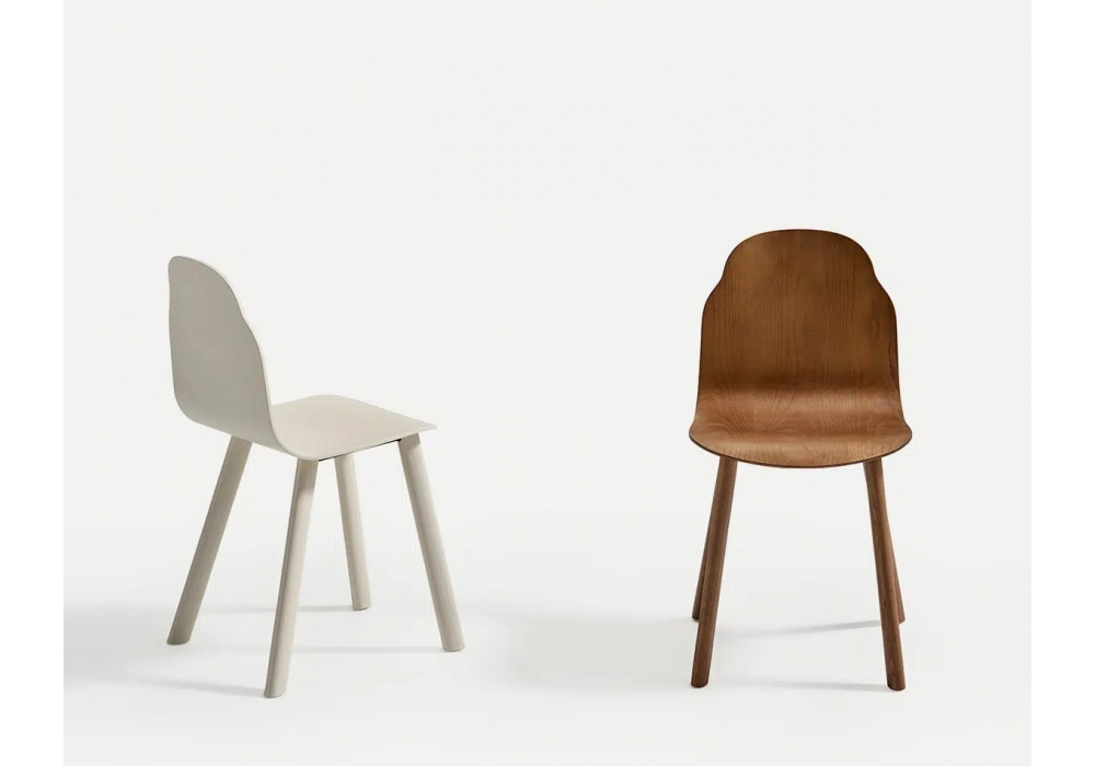Body Wood conçue par Sylvain Willenz pour Sancal est une chaise en bois, disponible en différentes finitions et dans la version avec accoudoirs métalliques de différentes couleurs ou sans.