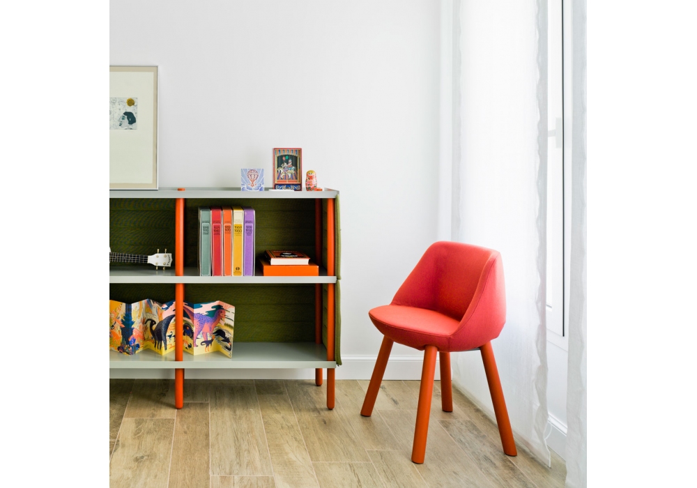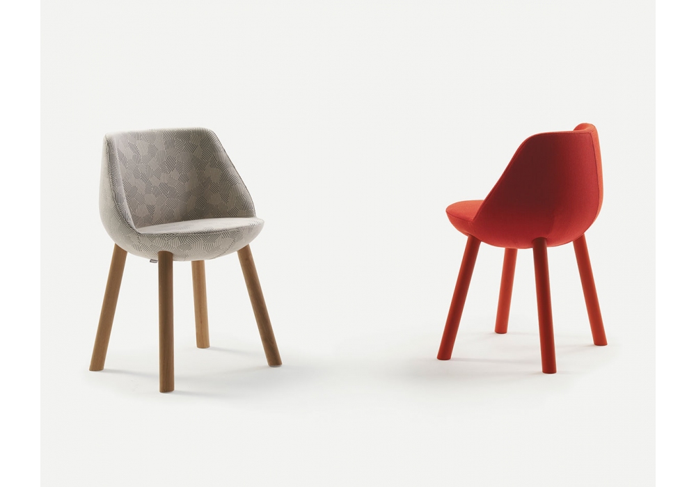 Magnum conçue par EstudiHac pour Sancal est une chaise avec pieds en métal ou en bois, coque rembourrée recouverte de tissu. Disponible en différentes finitions.