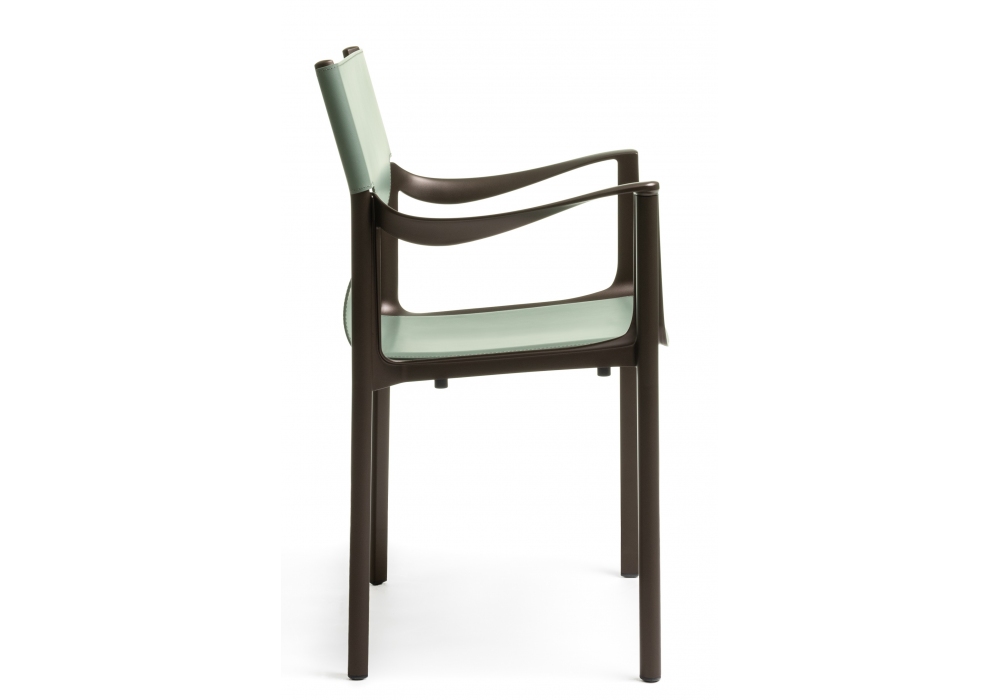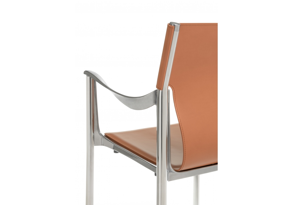 Venice conçue par Konstantin Grcic pour Magis est une chaise avec accoudoirs avec structure en aluminium moulé sous pression peint en polyester ou poli. Assise et dossier en cuir.