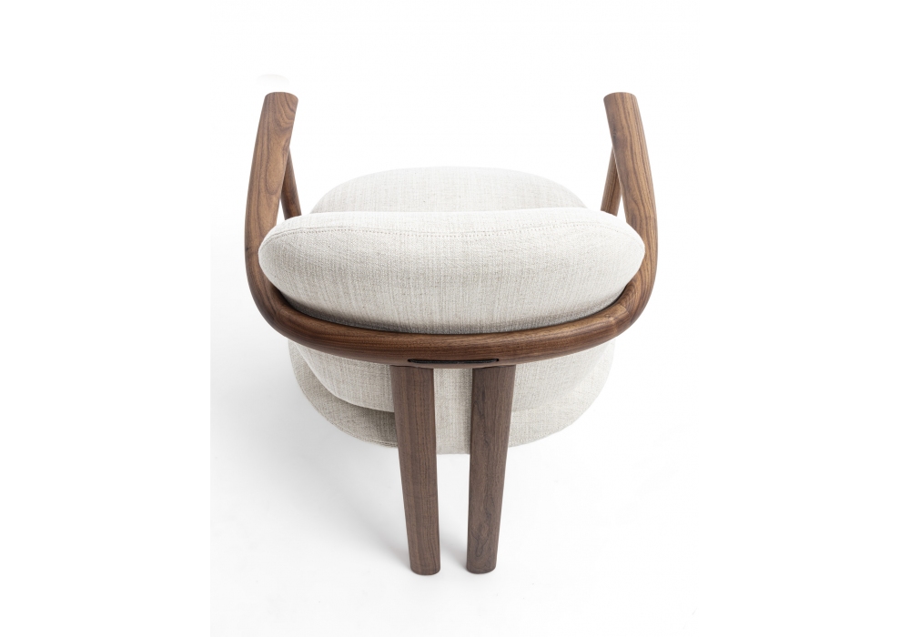 Teti conçue par G. & O. Buratti pour Porada est une chaise avec accoudoirs, dotée d'une structure en noyer canaletta massif et d'un revêtement en tissu ou en cuir. Un cordon en cuir ciré finition Testa di Moro maintient le coussin de dossier (amovible).
