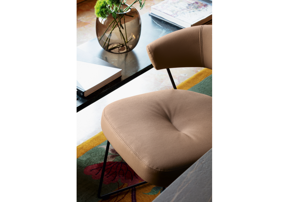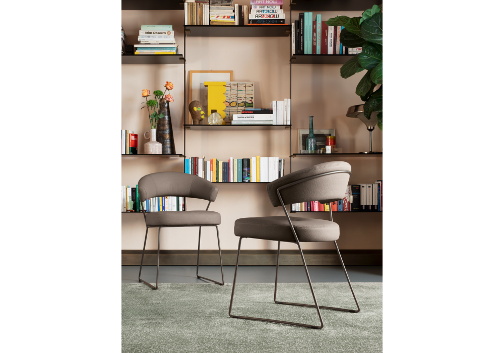 NY Anniversary conçue par Connubia est une chaise avec une structure en métal peint, une assise et un dossier rembourrés en tissu ou en cuir. Disponible en différentes finitions.