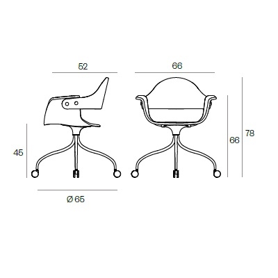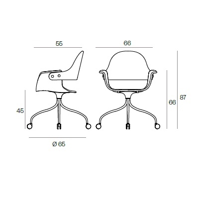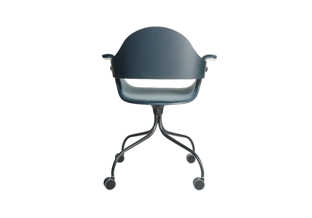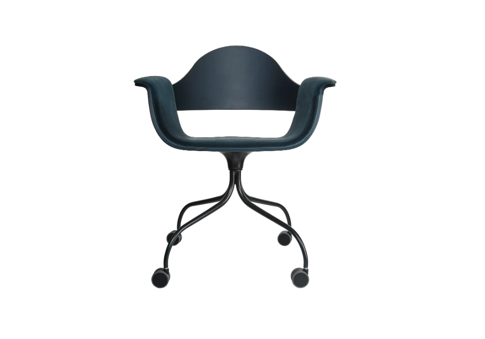 Showtime, conçue par Jaime Hayon pour BD Barcelona, est une chaise pivotante en métal à roulettes. Sa coque est en contreplaqué de hêtre et son revêtement est disponible en différents tissus ou cuirs.