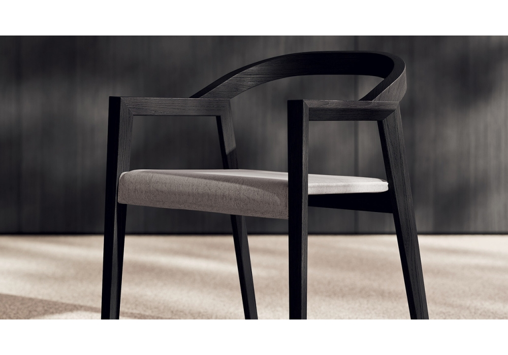 Kelly conçue par Kico est une chaise avec accoudoirs, dotée d'une structure en bois et d'un revêtement en tissu ou en cuir.