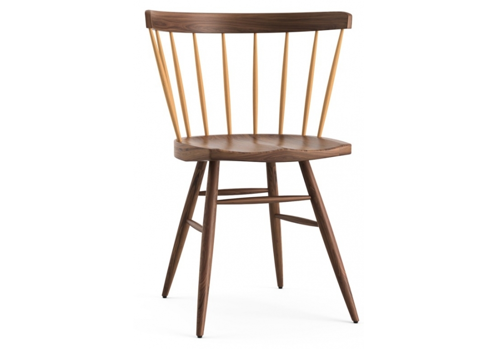 Straight, conçue par George Nakashima pour Knoll, est une chaise réalisée en noyer américain massif. Les montants du dossier sont en hickory et contrastent agréablement avec toutes les autres parties en noyer américain en finition transparente.