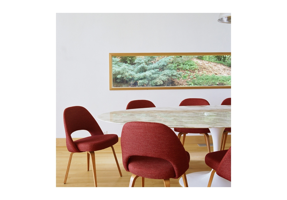 Saarinen, conçu par Eero Saarinen pour Knoll, est un fauteuil de direction avec pieds en acier chromé poli, peint en noir ou en bois dans différentes finitions. Revêtement en tissu ou cuir.