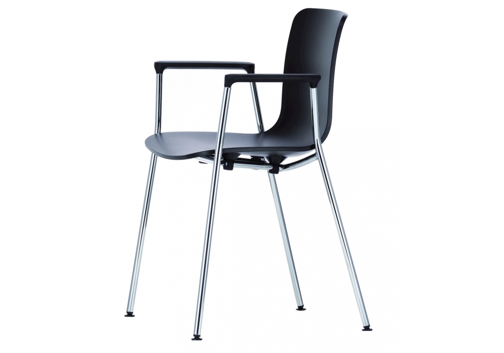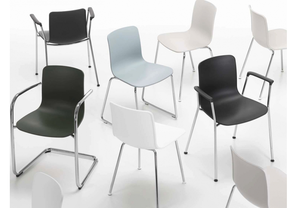 HAL RE Tube Armrest conçue par Jasper Morrison pour Vitra est une chaise avec base à quatre pieds en acier tubulaire, finition chromée et coque en polypropylène recyclé teinté dans la masse. Disponible en différentes finitions.