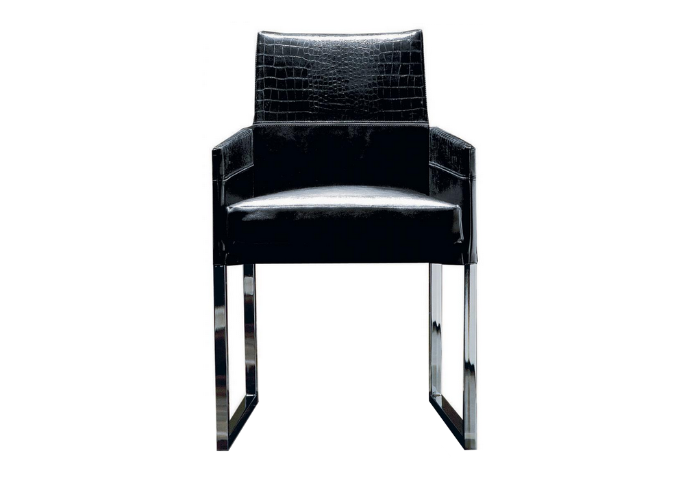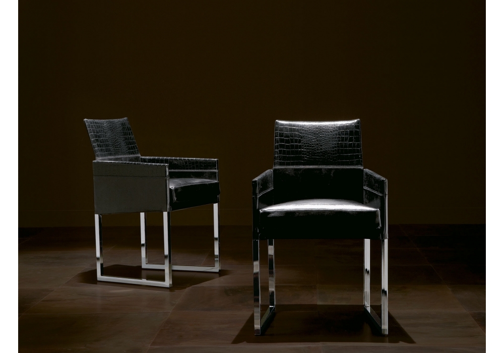 Akita Chic conçue par Rugiano est une chaise avec structure recouverte de cuir en différentes finitions et pieds en acier bronzé ou chromé.