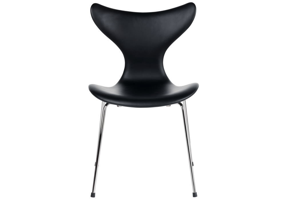 Lily conçue par Arne Jacobsen pour Fritz Hansen est une chaise réalisée avec un revêtement en tissu ou en cuir et 4 pieds en acier tubulaire chromé.