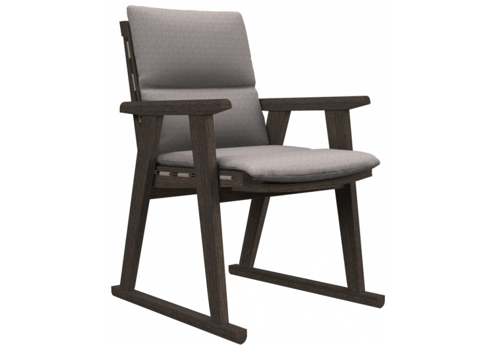 Gio, conçue par Antonio Citterio pour B&B Italia Outdoor, est une chaise avec accoudoirs avec structure en teck massif finition gris antique, cerclage en polypropylène gris tourterelle. Revêtement en différents tissus.