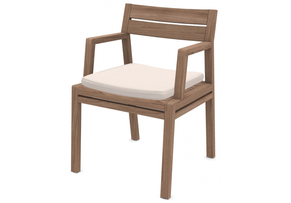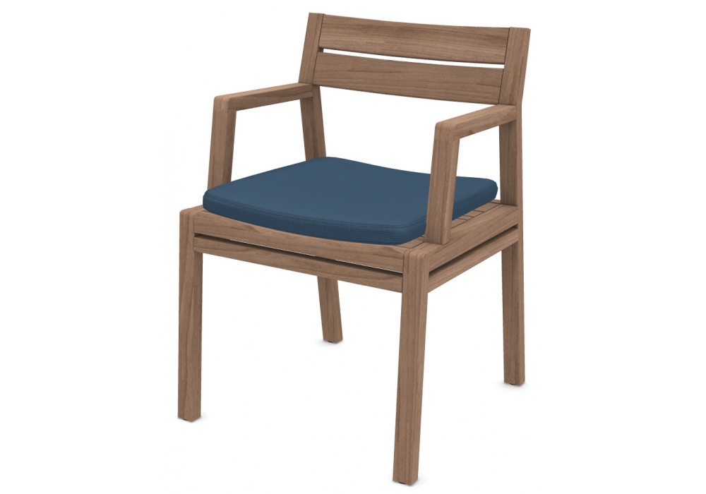 Costes conçue par Ethimo est une chaise avec structure en teck naturel ou décapé et coussin de siège avec revêtement en tissu acrylique, disponible en différentes couleurs.
